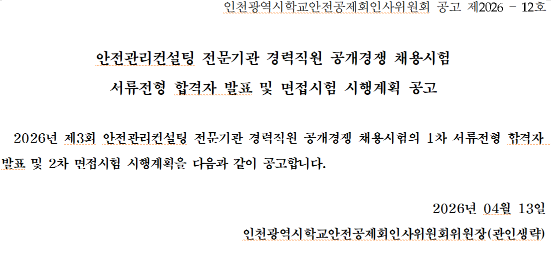 2026년 제3회 안전관리컨설팅 전문기관 경력직원 공개경쟁 채용시험 서류전형 합격자 발표 및 면접시험 시행계획 공고